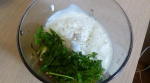 - Per prima cosa, prepara un condimento per insalata.  Nella ciotola del frullatore mettere aglio, peperoncino, prezzemolo, aceto, sale, pepe e yogurt. Aggiungi un po ‘di olio d’oliva e macina tutto fino a quando uniformità.