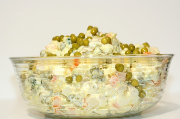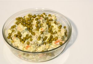 Mandiamo panna acida all’insalata pronta, maionese, bene mescolare, trasferire in un’insalatiera, cospargere con conserve piselli e servire sul tavolo festivo.