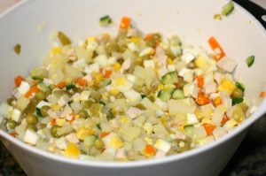 Lavare le uova con una spugna e far bollire in acqua per 8-10 minuti. Patate con cuocere le carote in acqua salata. Petto di pollo (può essere assunto con la pelle) far bollire in acqua salata per 25-30 minuti, eventualmente aggiungere terra pepe e alloro. Tutto fresco e pulito. Separare la carne da ossa.
