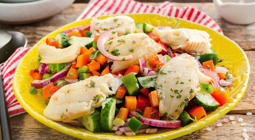 Insalata calda leggera, saporita e sana con pesce bianco, cetriolo e peperone, puoi cucinare facilmente a casa secondo la mia ricetta. L’insalata può essere preparata per uno spuntino, un pranzo o una cena.