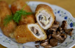 Stendere su costolette preparate da un lato funghi fritti con cipolle (¼ parte), aggiungere un blocco di formaggio, piega leggermente la carne attorno ai bordi e trasformala in involtini. Immergi la farina, l’uovo sbattuto e il pane generosamente nel pangrattato.