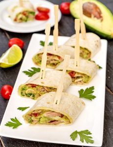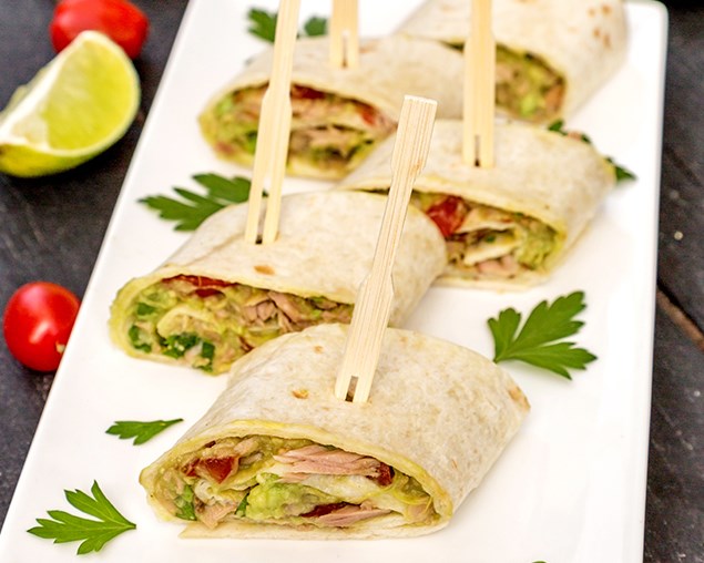 Tagliare gli involtini di tortilla pronti con tonno e avocado con piccoli rotoli, mettere su un piatto, bucare con un bastoncino per tartine e servire immediatamente.