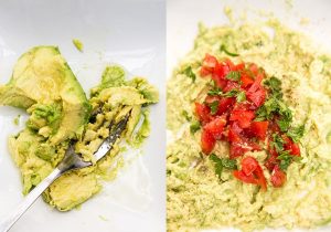 Sbucciare l’avocado, impastare con una forchetta e aggiungere tritato pomodoro a dadini, prezzemolo tritato finemente, pepe macinato e sale.