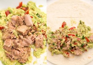 Aprire il tonno in scatola, impastare con una forchetta, inviare in pasta di avocado, mescolare. Miscela di pesce (½ parte) spalmare su tortillas, cospargere con cipolle verdi, in modo uniforme distribuire, trasformare in rotoli, avvolgere con un foglio e raffreddare almeno 1 ora.