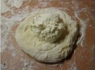 - Dividiamo l’impasto in 6 parti identiche. Cospargi abbondantemente sul tavolo o un tagliere di farina in modo che l’impasto non si attacchi. Prendiamo una parte e ricavarne una torta, mettere al centro una buona porzione di formaggio e raccogliere delicatamente l’impasto in un sacchetto.