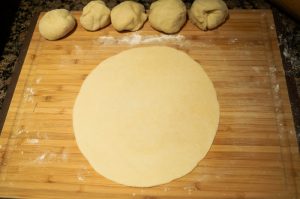 Dividi l’impasto in 4 parti. Arrotolare ciascuno di essi in modo sottile e con usando un mattarello, trasferire in un secco preriscaldato alla padella.