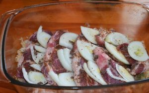 Versare l’olio in una forma resistente al calore (3 cucchiai), uniformemente lungo il fondo distribuiamo il cavolo preparato (½ parte), mettiamo le fette collo di maiale, tra loro abbiamo cipolle, foglie di alloro, cospargere con condimento di maiale (opzionale) e pepe macinato.