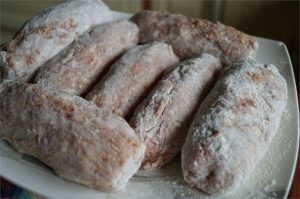 Chiudere il ripieno con carne macinata, fare una cotoletta oblunga e rotolare nella farina. Usando questo metodo, prepariamo l’intero ripieno.