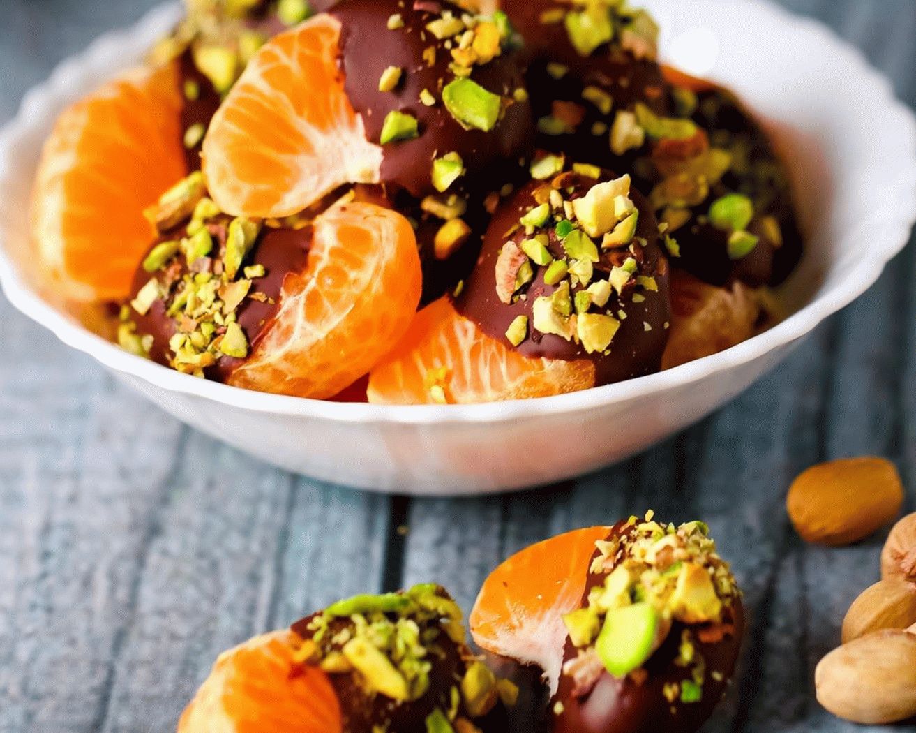 - Immergi ogni fetta di mandarino nel cioccolato e cospargilo pistacchi. Lo distribuiamo su un piatto.