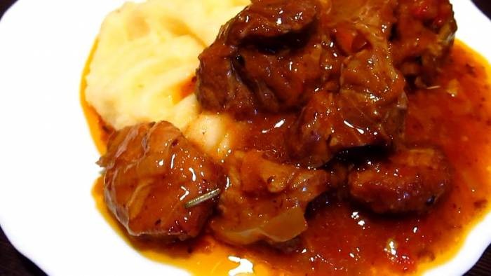 Prepareremo un piatto tradizionale, familiare fin dall’infanzia, a casa per cena. Delizioso manzo con salsa è servito con purè di patate.