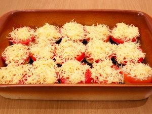 - Il prossimo strato di pomodori, pepe, sale.  Cospargere con grattugiato formaggio.