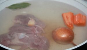 - Tagliare il maiale a dadini e lessarlo con cipolle, una foglia di alloro e grani di pepe 30 min.  Rimuovi cipolla e pepe.