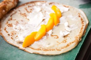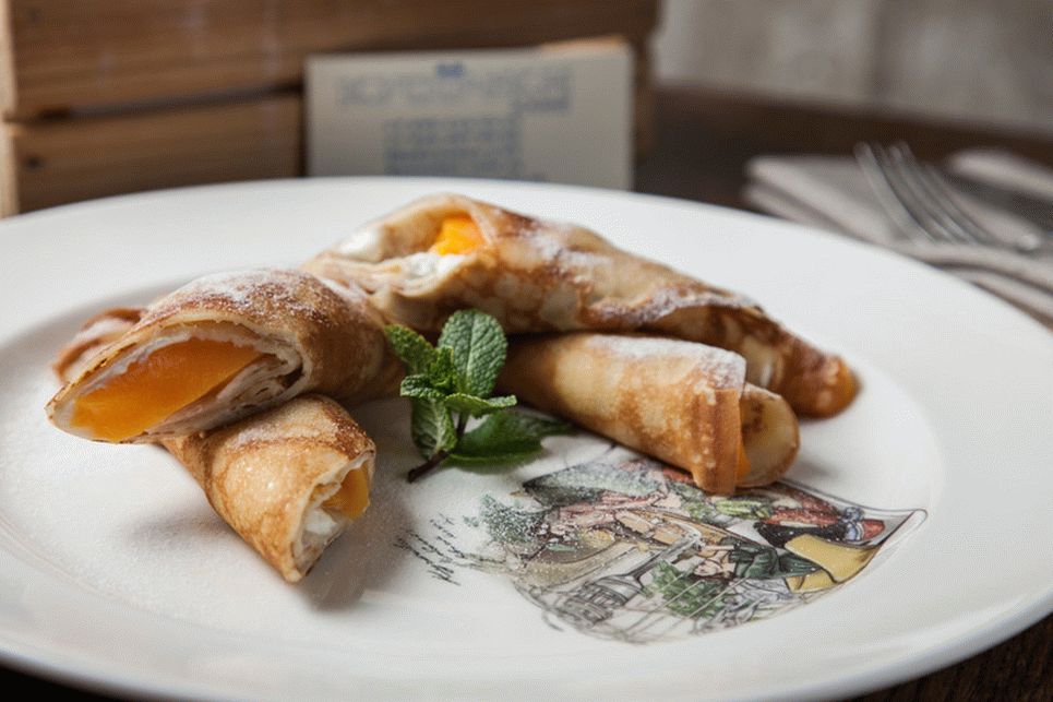- Ungiamo il pancake finito con la ricotta. metti qualche fetta pesca. Rotolo delicatamente il rotolo.