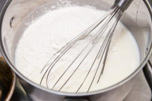 - Aggiungere la farina setacciata in parti, mescolando costantemente con usando una frusta. L’impasto dovrebbe essere come panna acida liquida. Aggiunta olio vegetale e miscela.