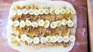 - Ungere l’impasto con il burro, cospargere con chiodi di garofano, cannella e noci, metti la banana a file.