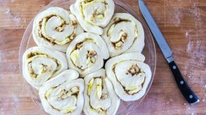 - Quindi arrotolare l’impasto in un rotolo e tagliarlo in 8 identici parti. Preriscalda il forno a 180 gradi.