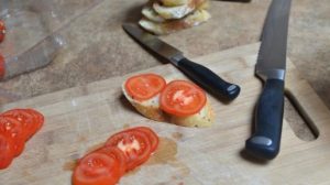Tagliare le baguette a fette, i pomodori a fette. Diffondere 2 fette di fette di pomodoro baguette.