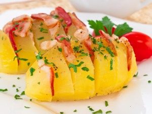 - Lavare e sbucciare le patate, tagliare con un coltello affilato attraverso il tubero (non completamente) ad una distanza di 1 cm l’uno dall’altro.
