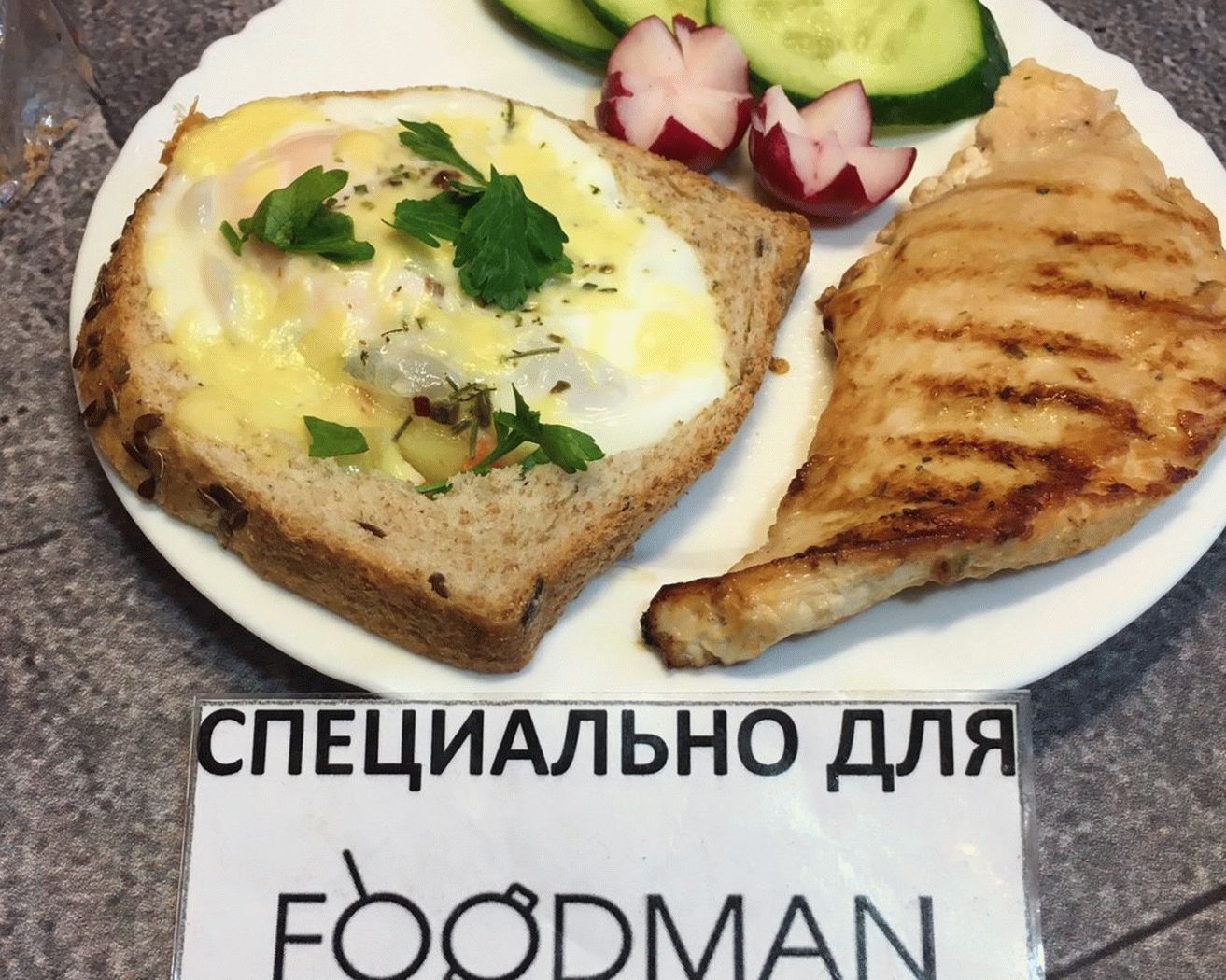 - Metti il petto di pollo e toast con l’uovo su un piatto, colazione pronto per due.