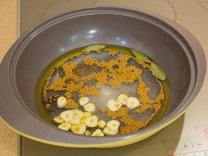- Metti una pentola d’acqua sul fuoco, metti lo zucchero in una pentola, sale, pepe, alloro, semi di senape, affettati aglio, olio vegetale.