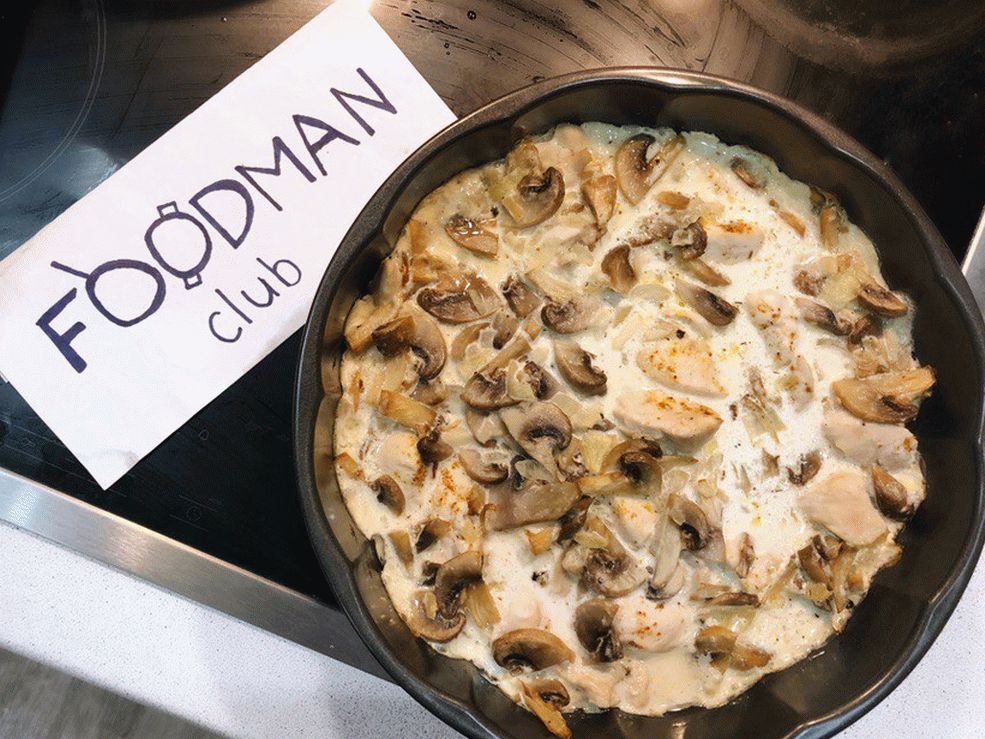 - Spostiamo la salsa di funghi nella forma sopra il filetto di pollo, distribuire uniformemente.