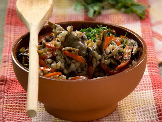 - Mentre i cuori stufano, laviamo il grano saraceno. Aggiungilo al calderone a cuori, aggiungi acqua calda (l’acqua dovrebbe essere due dita sopra il cereale), pepe, sale e rimettere sul fuoco o dentro il forno. Porta il piatto alla prontezza. Porridge è molto gustosa.