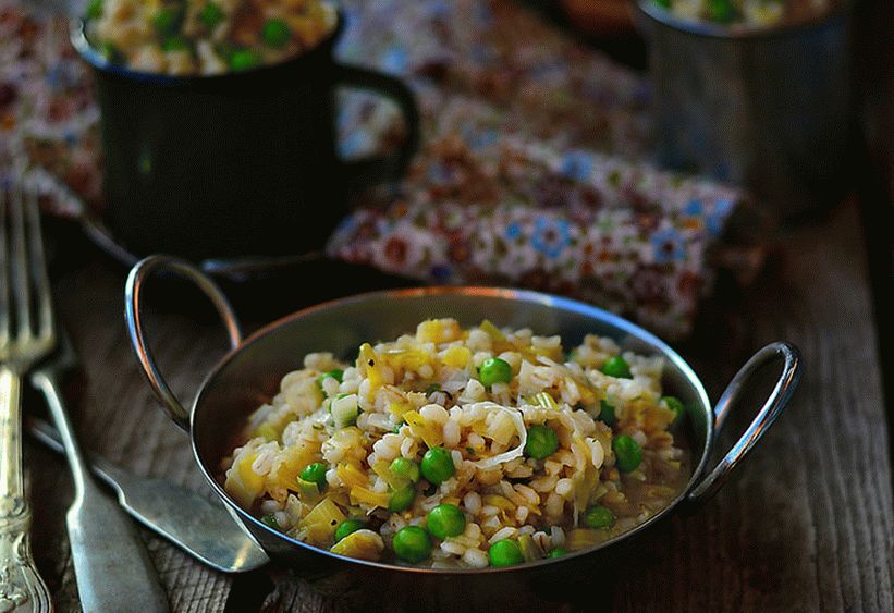 Orzo abbondante e gustoso con pollo in scatola e mais con piselli decorerà un tavolo apparecchiato per la cena o cena e grazie allo speciale stile di cottura dei cereali a casa sarà ricordato per molto tempo.