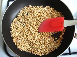 Risciacquare l’orzo perlato e rosolare in una padella separata e asciutta. fino a quando appare un leggero sapore di nocciola.