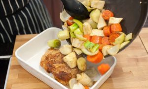 Il prosciutto di maiale risulterà incredibilmente succoso e gustoso, se lo è pre-friggere in una padella e cuocere a casa in forno con radice di sedano, carote e porri.