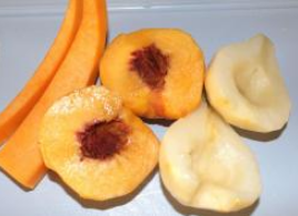 - Lavare accuratamente la pera e la pesca, rimuovere la buccia e i semi. Frutta e zucca devono essere tagliate a fette e passate attraverso mietitrice, ottenendo purè di patate.