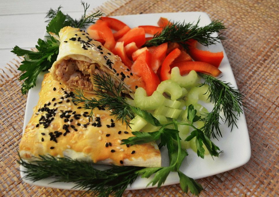 - Tagliare il pane pita in 4 strisce, mettere il ripieno su ciascuna e girare i triangoli.