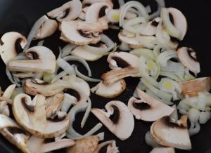 - Friggere le cipolle con i funghi in una piccola quantità di olio o su padella antiaderente senza olio. Sale e pepe