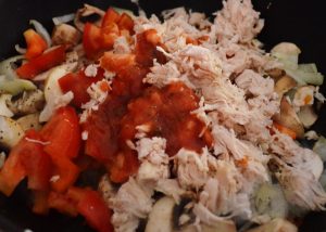 - Aggiungi i pomodori tritati, i peperoni, la carne e la salsa di pomodoro. Coprire, cuocere a fuoco lento per dieci minuti.