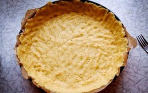 - Posare la pergamena sopra l’impasto, versarlo ben asciutto fagioli o piselli (in modo che l’impasto non si alzi dallo stampo). Cuocere forno per 15 minuti a una temperatura di 2000 ° C. Tira fuori il finito l’impasto, rimuovere i fagioli e la carta.
