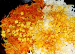 - Aggiungi il mais alle verdure finite (la salamoia deve essere drenata), riso, curry e curcuma.