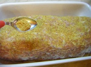 Distribuiamo il rotolo preparato in una forma unta, coprire con proteine montate e cospargere con condimento di maiale.