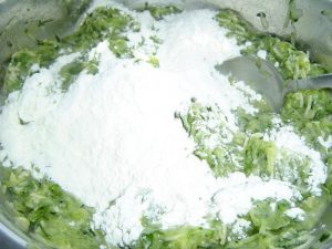 - Grattugiare il formaggio e aggiungerlo alle zucchine. Versare le uova e cospargere di spezie. Mescolare.
