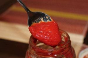 - Aggiungi verdure alla passata di pomodoro, usando uno spremi aglio spremere l’aglio, aggiungere sale, pepe e luppolo-suneli. Mescola e lascia in pace per 2-3 ore per preparare la salsa presente.