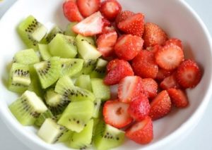 - Puliamo il kiwi dalla pelle, rimuoviamo le code dalle fragole. fetta a pezzi grandi.