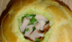 - All’eclair raffreddato tagliare la parte superiore, mettere formaggio, erbe, prosciutto.