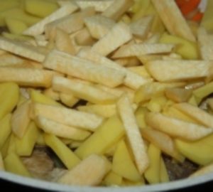 - Sbucciare patate e rape e tagliarle a cubetti.