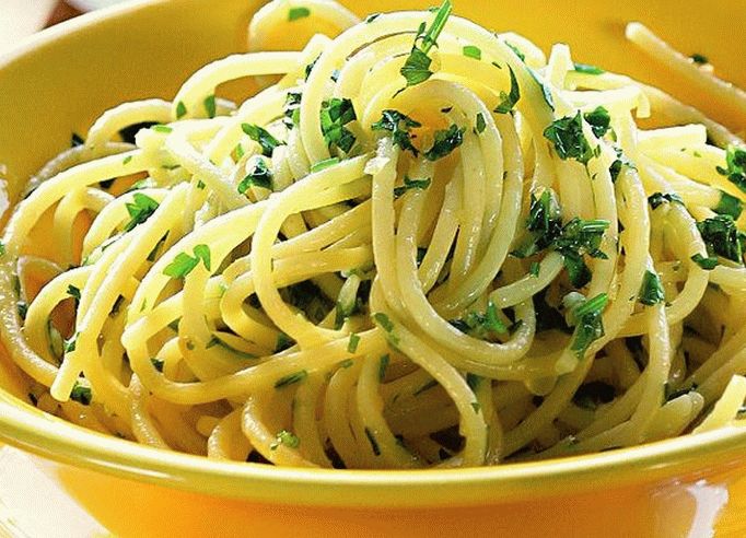 - Metti gli spaghetti in una padella, mescola un paio di minuti, quindi cospargere con prezzemolo e spegnere.