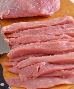 - Tagliamo la carne in strisce con una lunghezza di circa otto a dieci centimetri, uno spessore di un centimetro e due centimetri di larghezza.