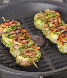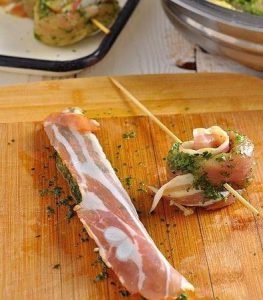 - Su una striscia di carne stendiamo una fetta del petto, giriamo rotolare, stringare su uno speciale spiedino di legno.
