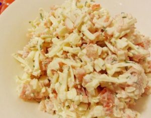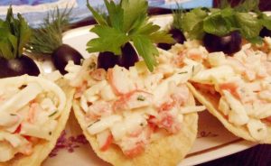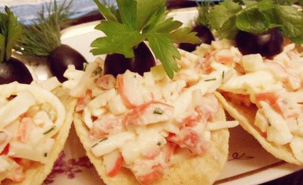 Mentre gli ospiti vanno al tavolo festivo, puoi offrirli spuntini veloci, ad esempio, da nutrienti bastoncini di granchio. tale non è difficile cucinare un delizioso aperitivo a casa, faremo il ripieno in anticipo e disponi le patatine prima di servire.