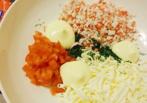 - Raccogli tutto in un piatto, aggiungi maionese, erbe, sale a piacere.
