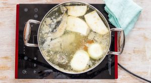 Successivamente, la schiuma appare sulla superficie della padella, di cui hai bisogno mettere insieme un cucchiaio forato. Aggiungi tutte le verdure al pesce, tritale finemente bisogno di cipolle in 4 parti, carote a metà, mettere una foglia di alloro e salare. Cuocere a fuoco molto basso per mezz’ora.