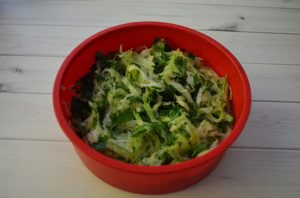 - Versare un terzo dell’impasto in uno stampo in silicone, aggiungere cavolo con prezzemolo