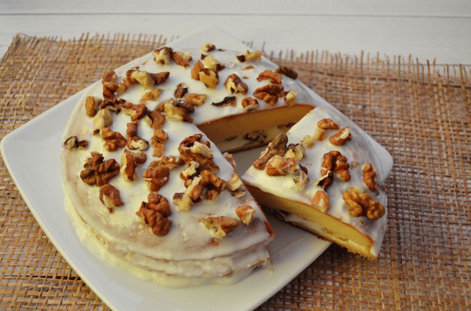 - Raffreddare la torta, tagliata in due strati di torta. Ungere una torta crema di yogurt, vaniglia e miele, aggiungere le noci. Copriamo la seconda torta, ungere l’intera torta con la panna e cospargere con le noci.