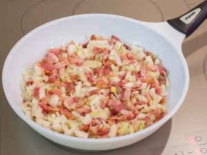 - Quindi, friggere leggermente la pancetta con le cipolle.